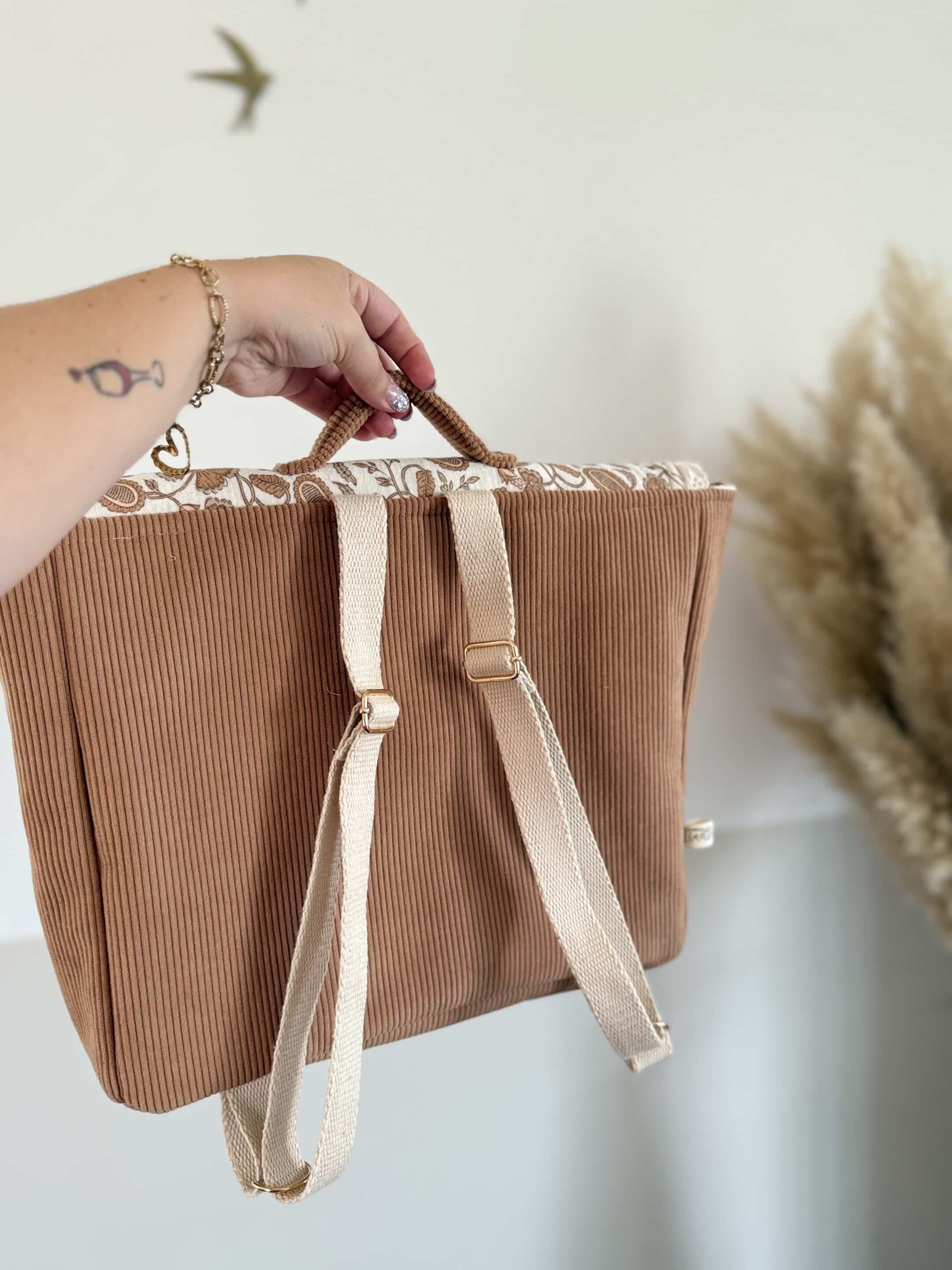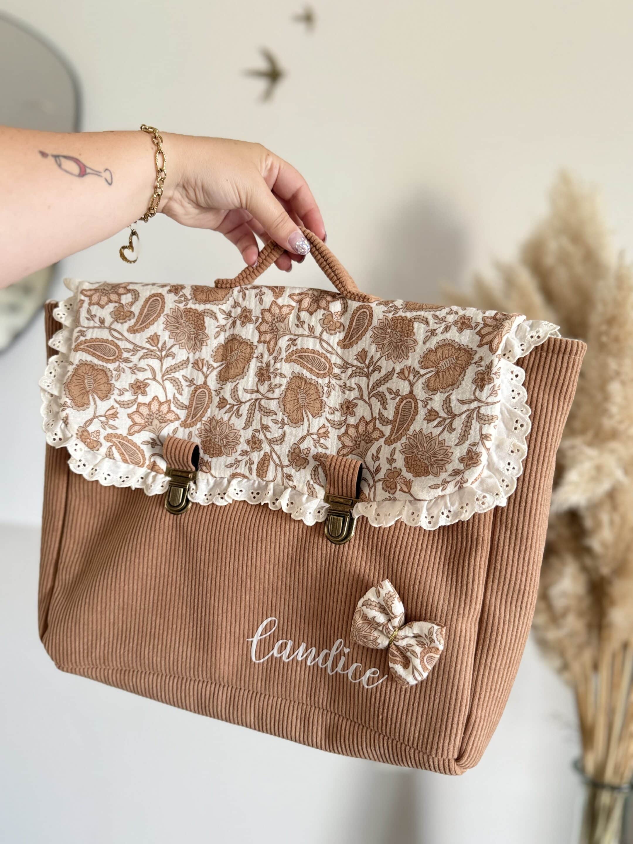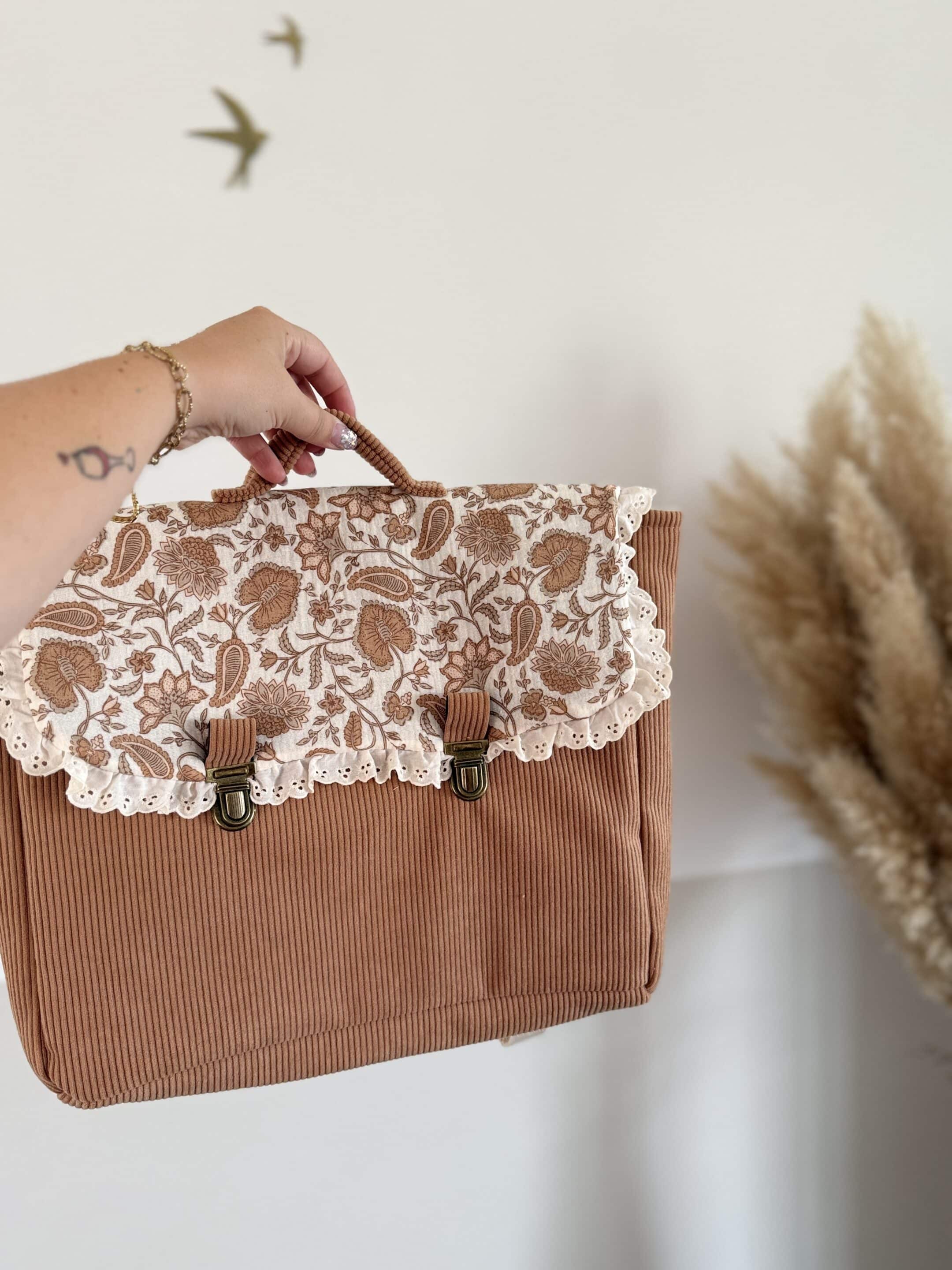 Soyez le premier à laisser votre avis sur “Cartable, velours côtelé camel et double gaze coeurs indy camel, broderie anglaise”
