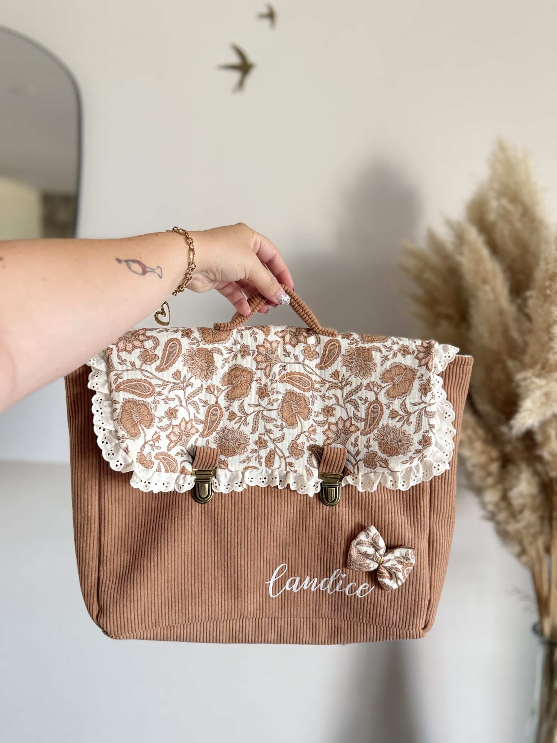 Cartable, velours côtelé camel et double gaze coeurs indy camel, broderie anglaise