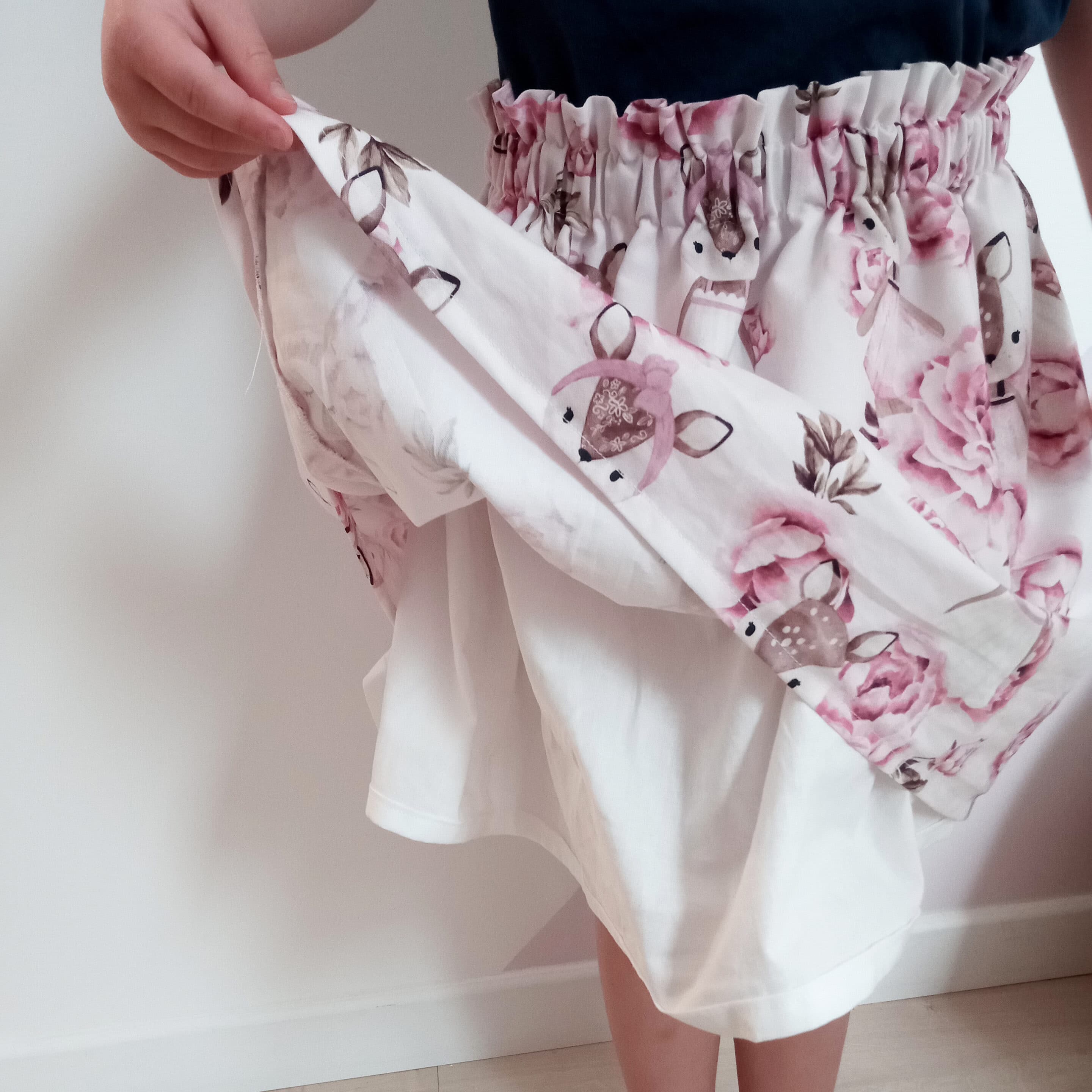 Afin que l’élastique fasse son effet et que la jupette ne glisse pas, il faut que le tour de taille de la petite fille soit plus grand que la taille de l’élastique de la jupette.
