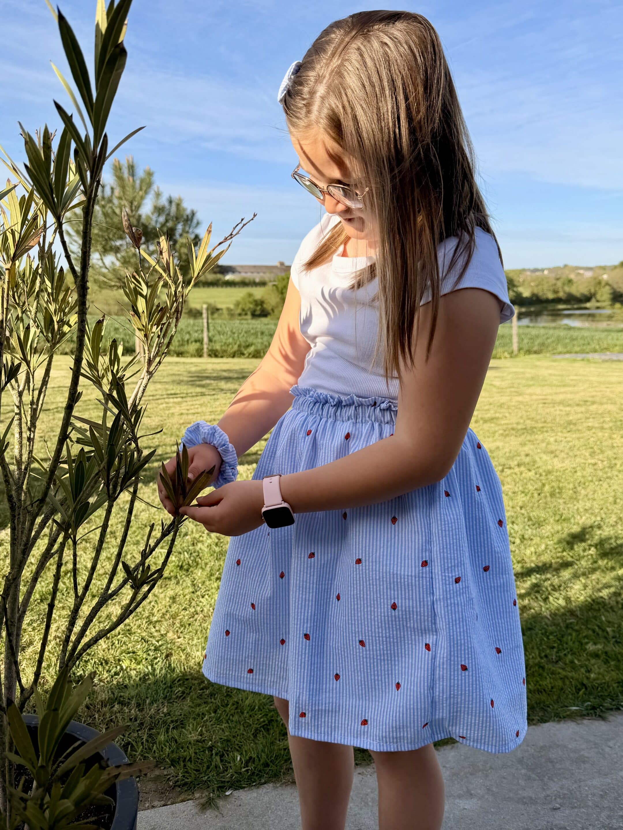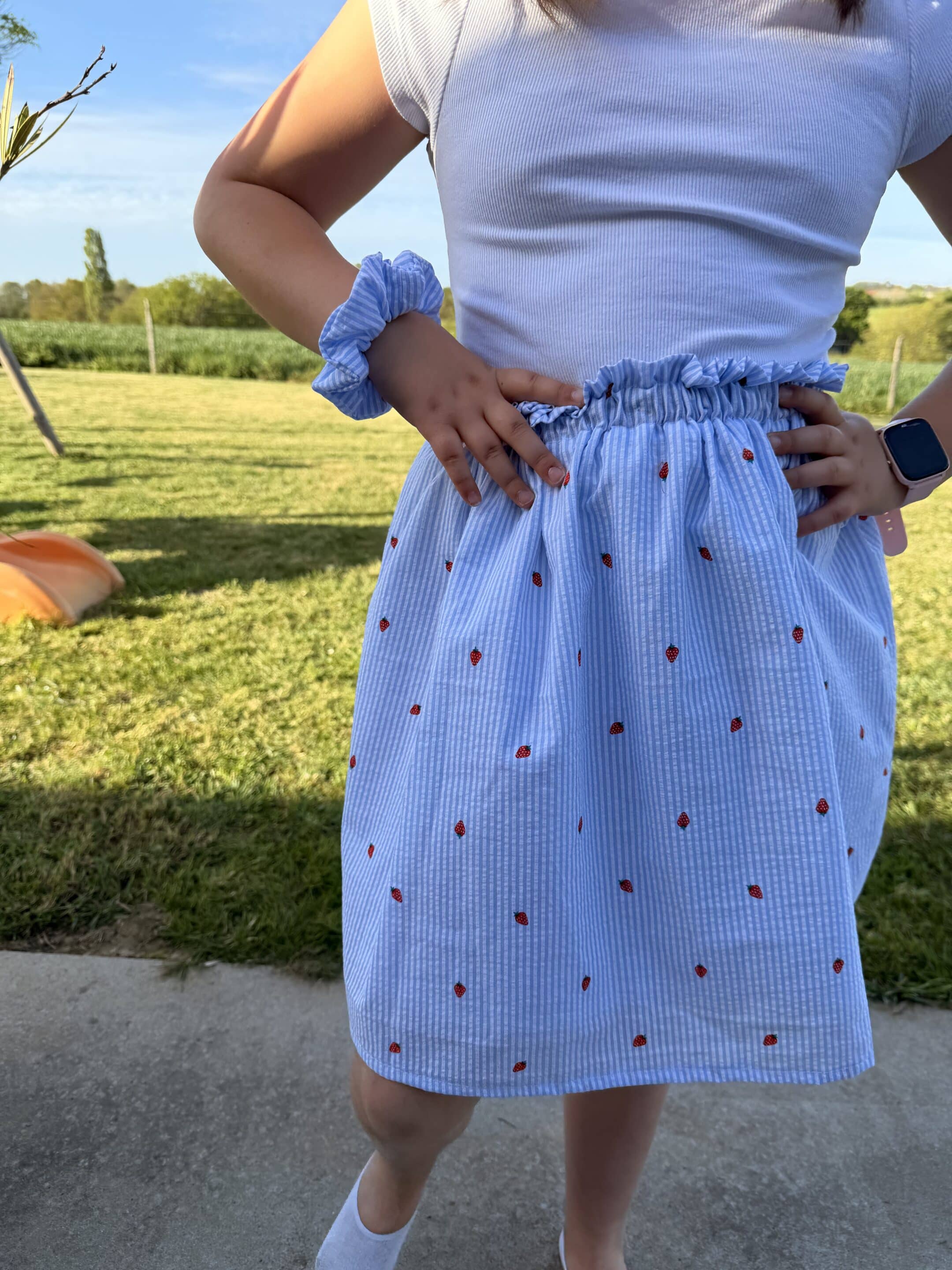 Afin que l’élastique fasse son effet et que la jupette ne glisse pas, il faut que le tour de taille de la petite fille soit plus grand que la taille de l’élastique de la jupette.