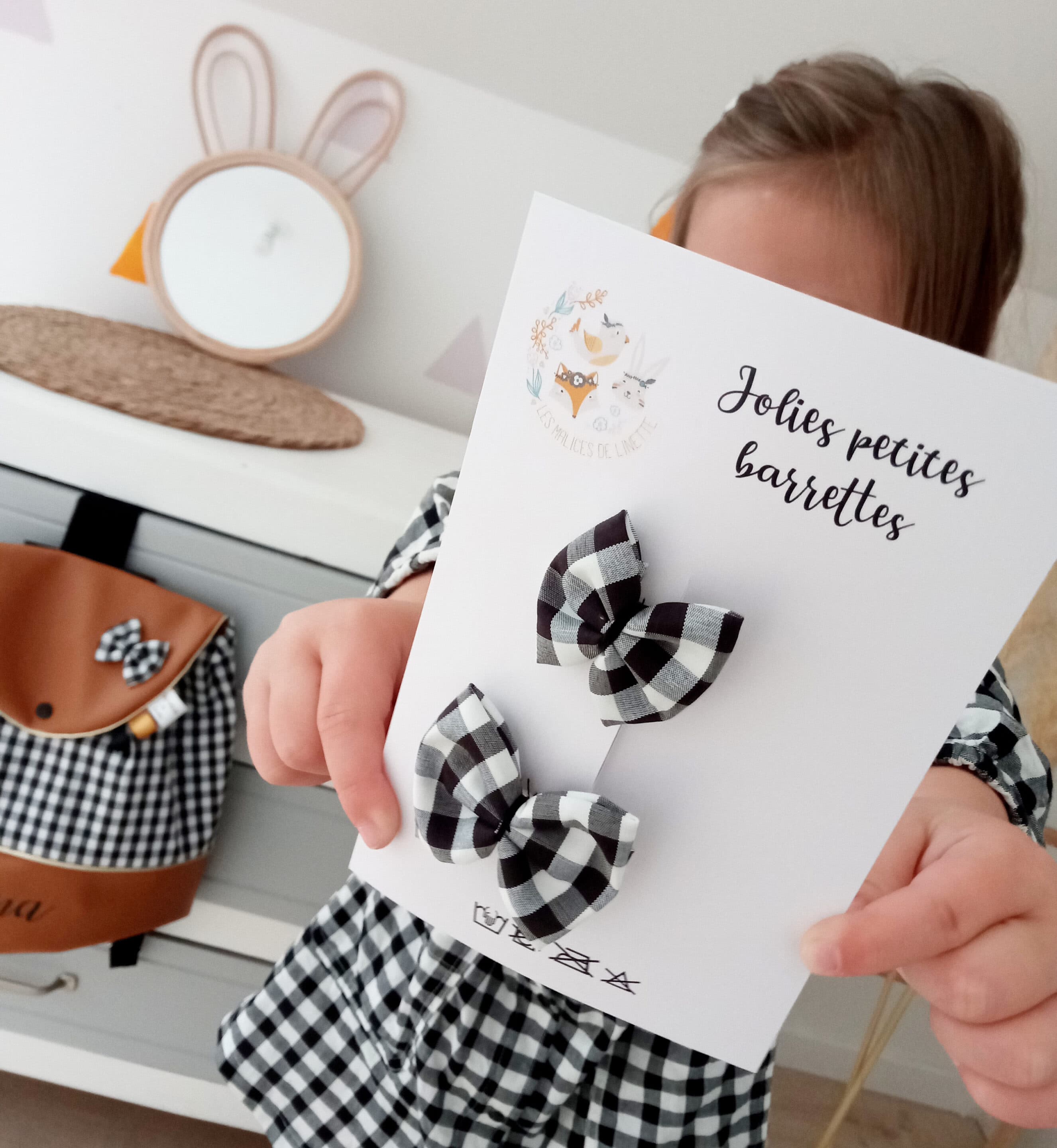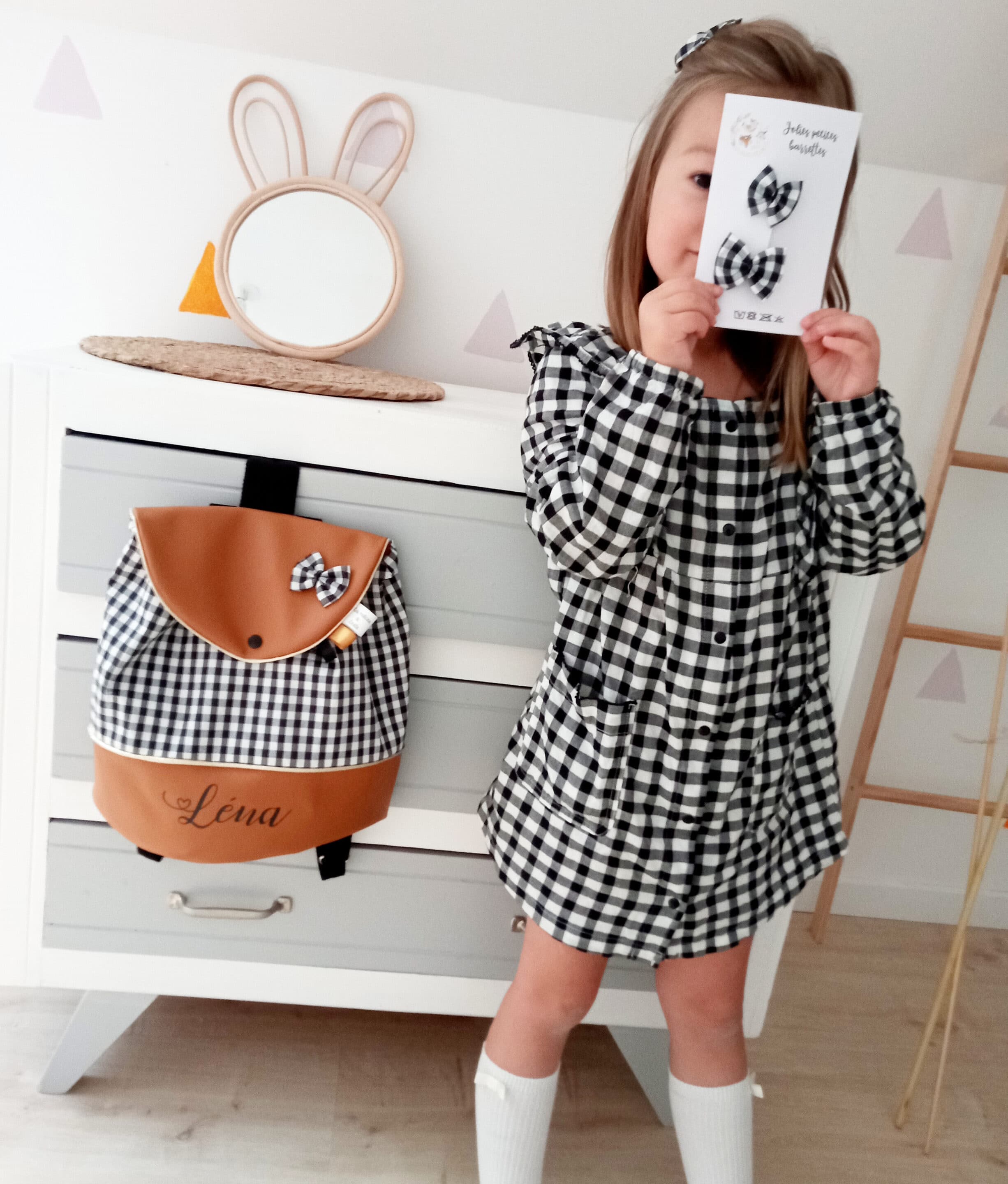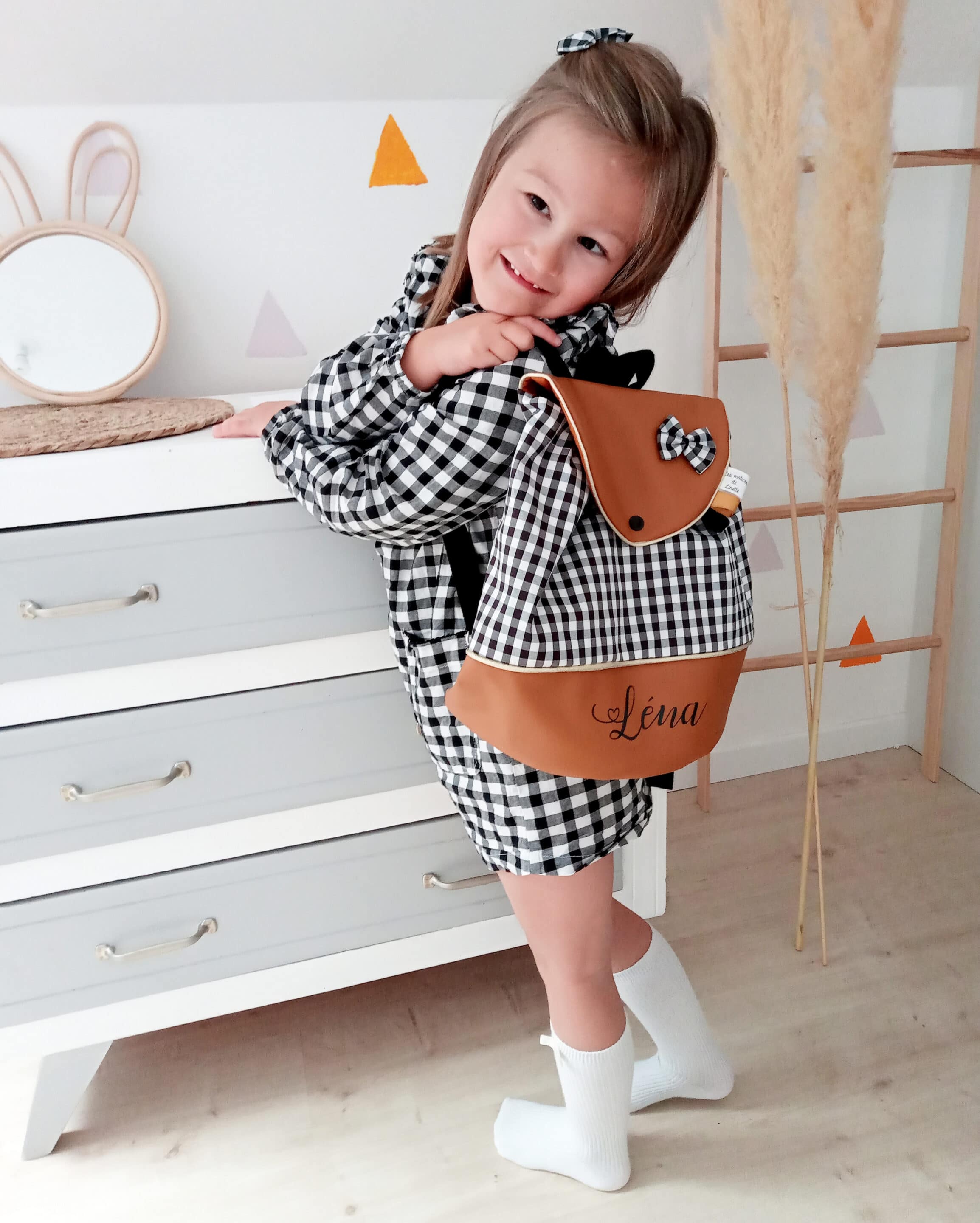 Possibilité d’ajouter le prénom de l’enfant sur le simili cuir ou le coton. Nœud en option.