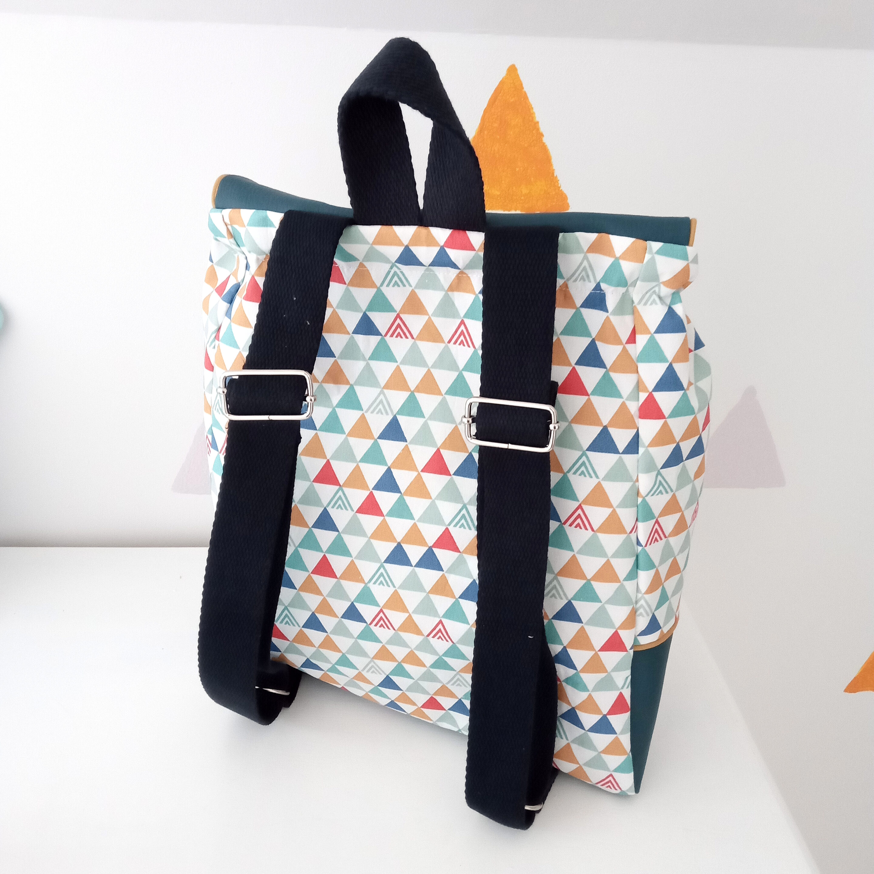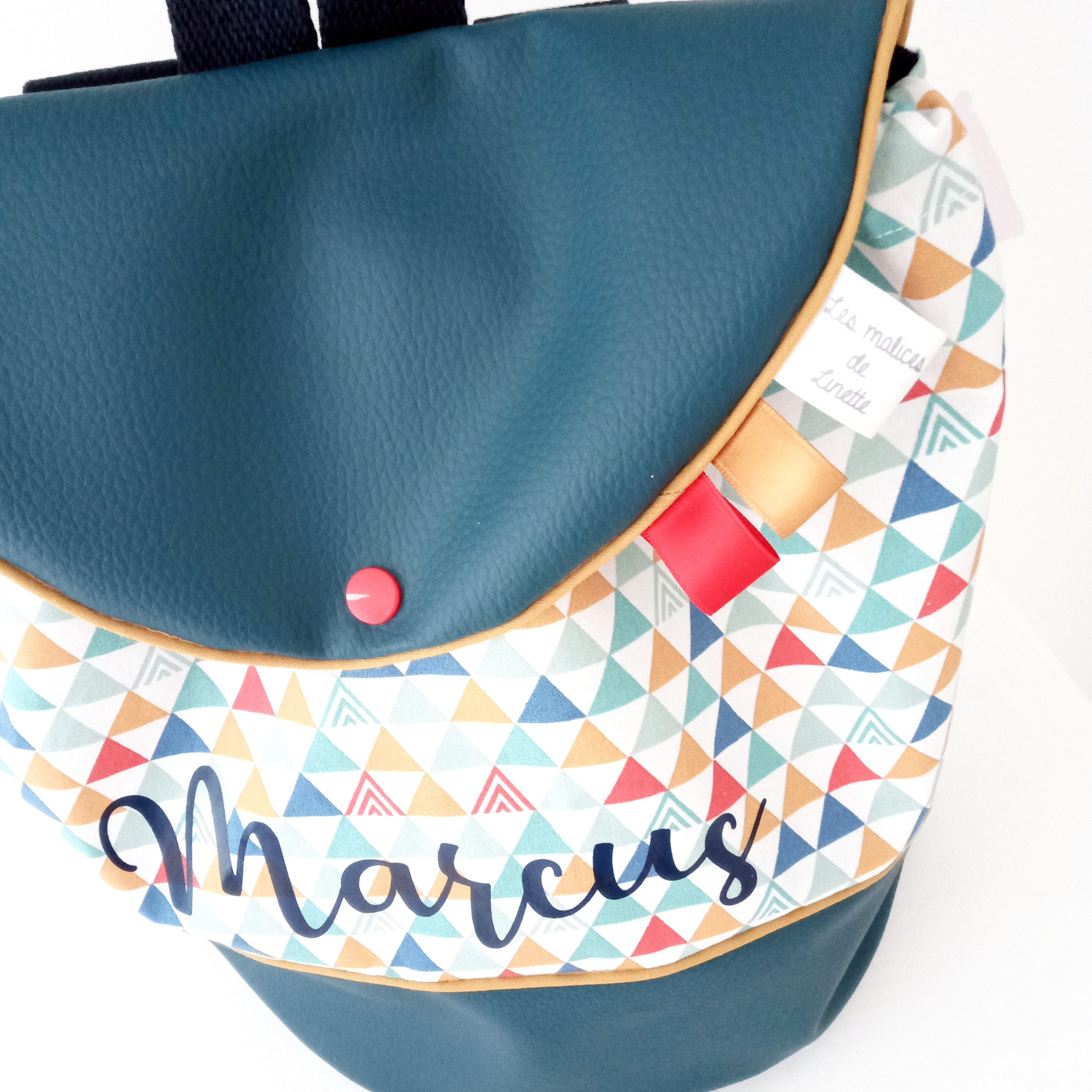 Sac à dos enfant, en coton et simili cuir, se ferme par un lien coulissant et une pression. Bretelles réglables.