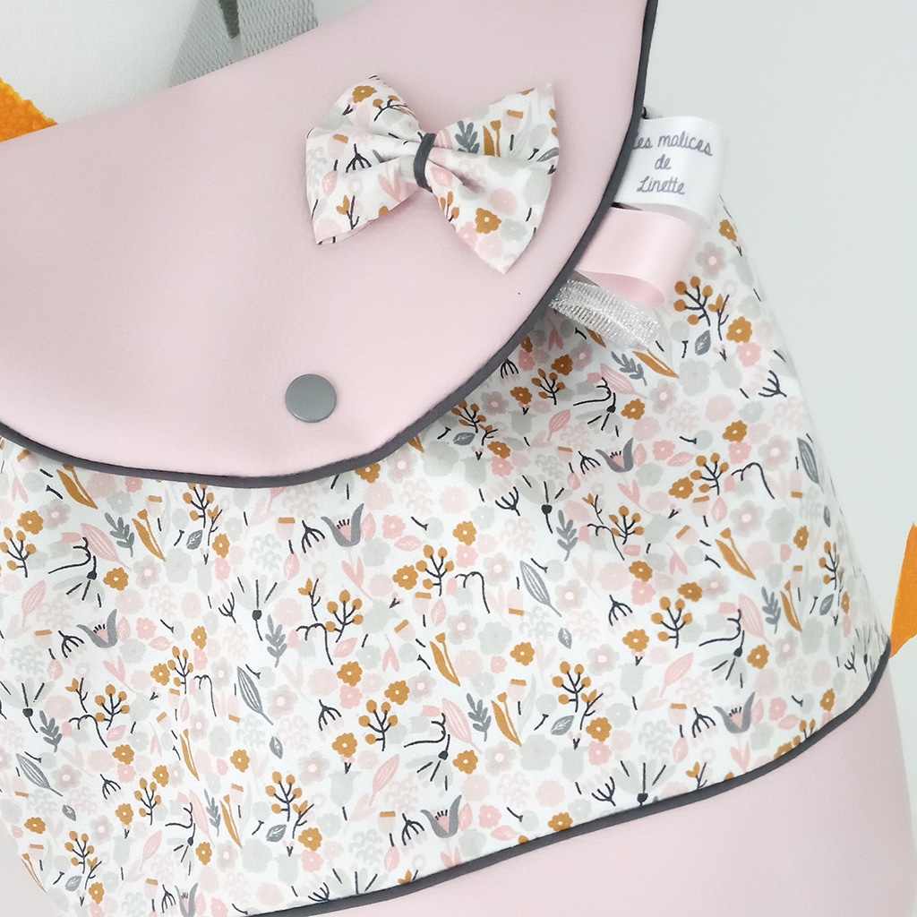 Sac à dos, simili rose et fleuri rose et passepoil anthracite