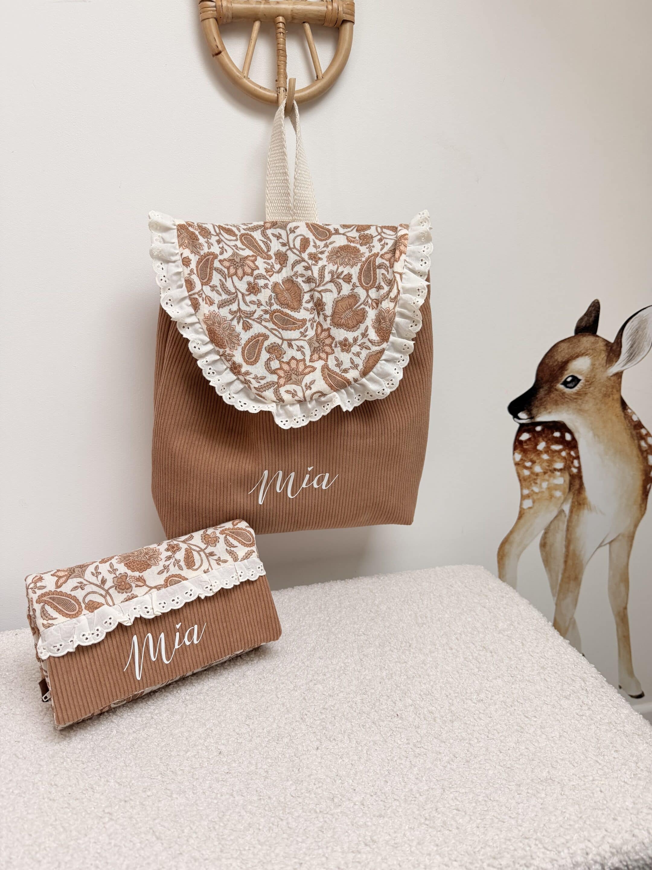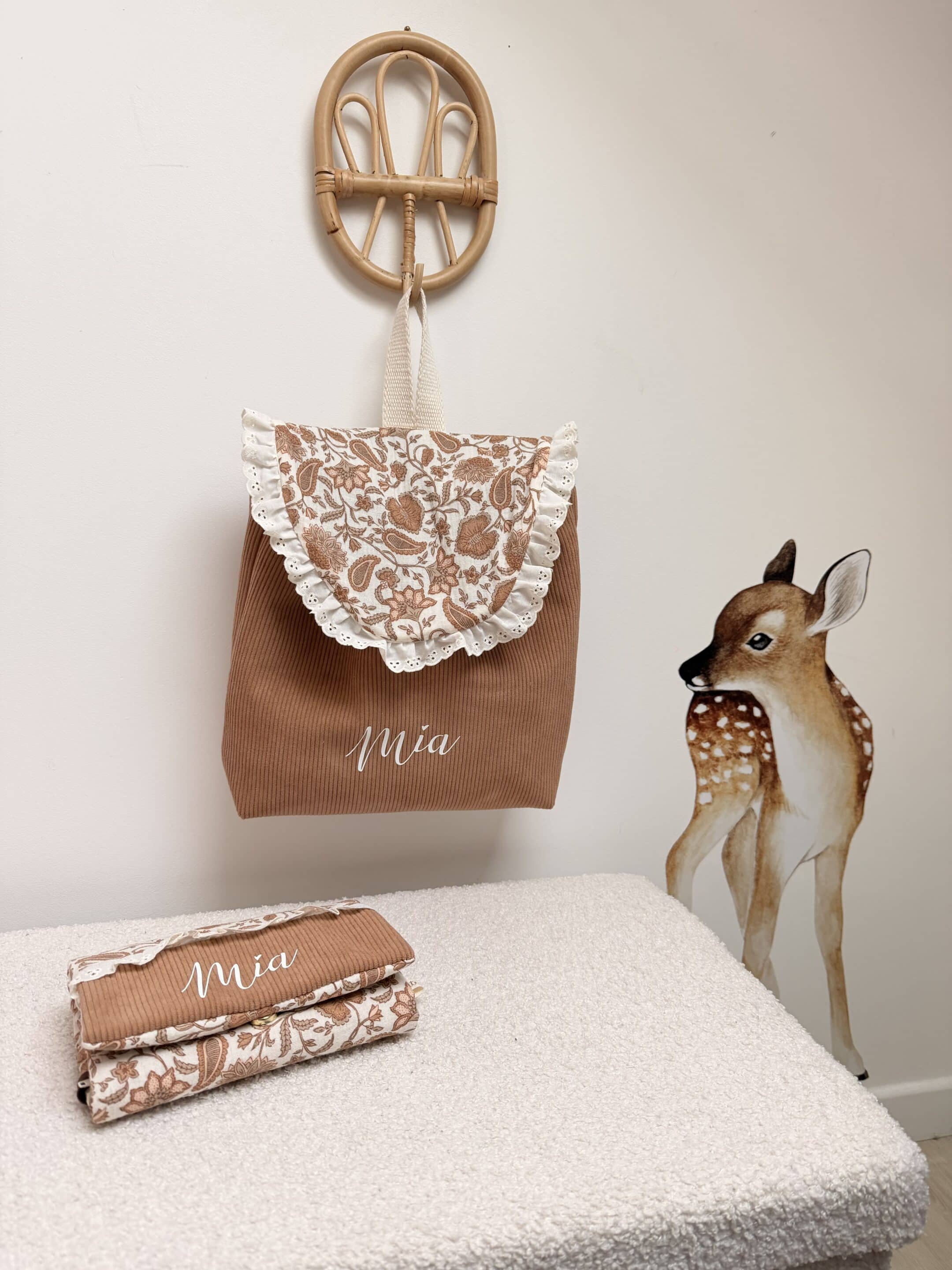 Sac à dos en velours côtelé et et double gaze à motifs à l’extérieur. Bordé par un joli ruban à volants.