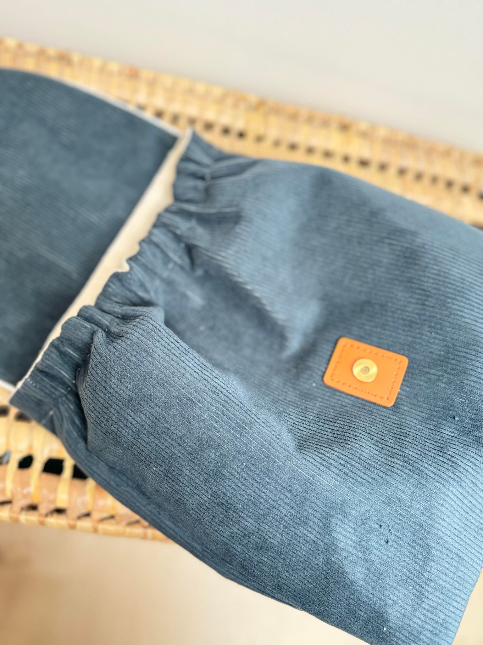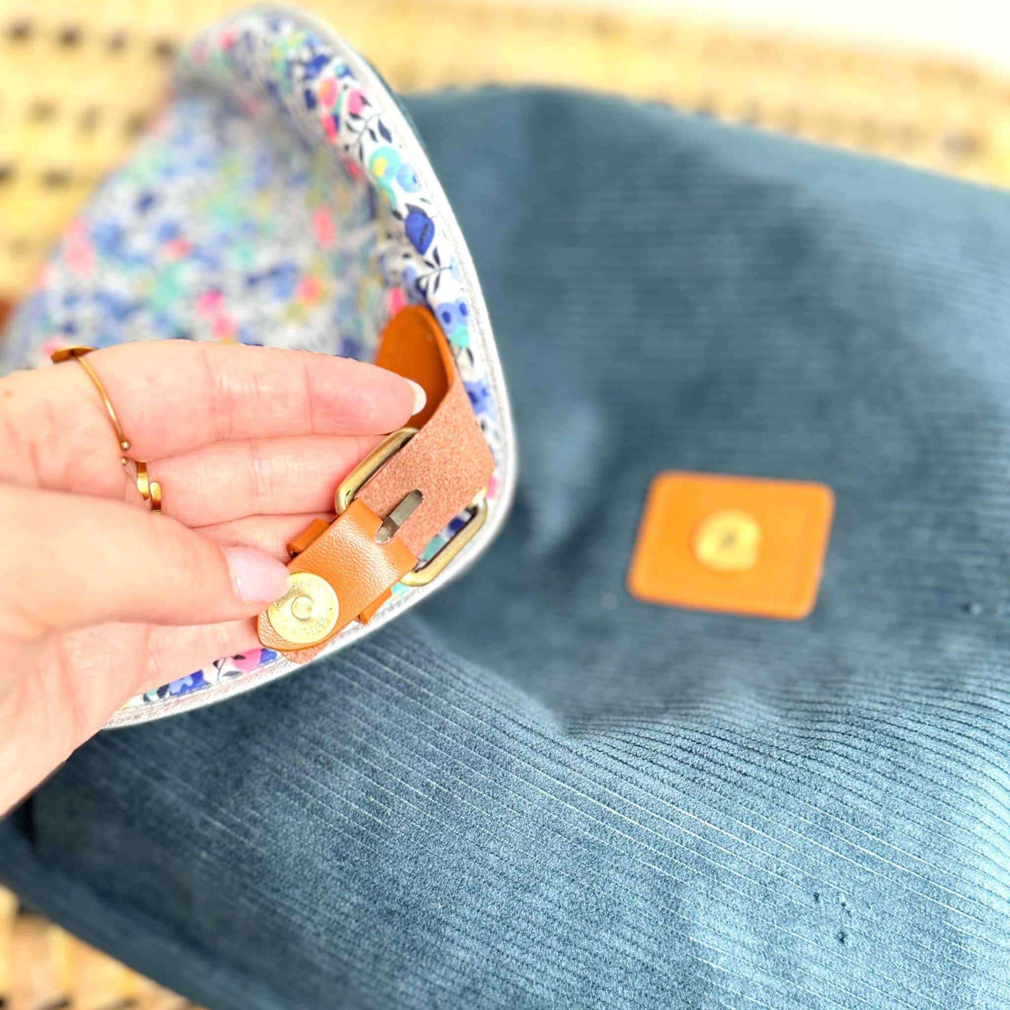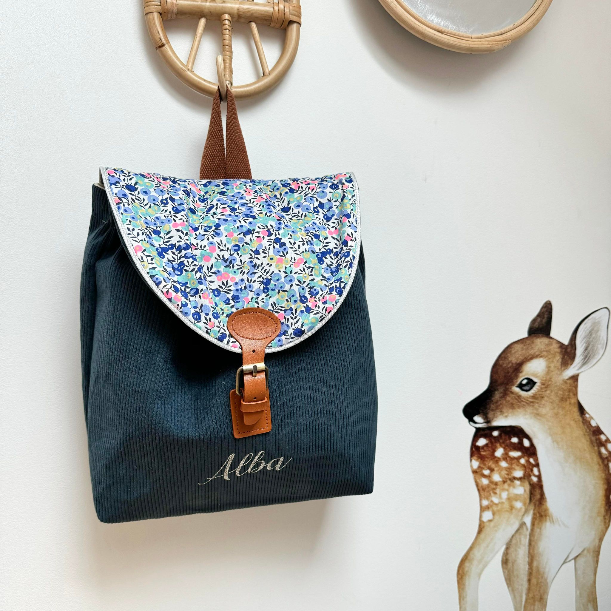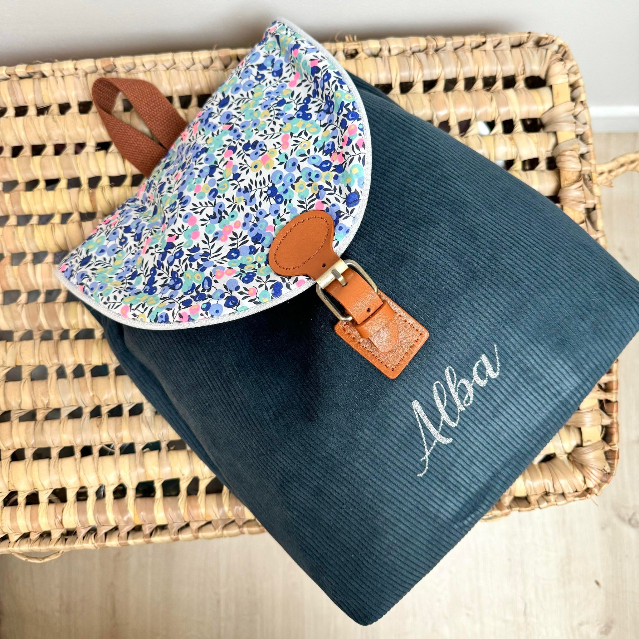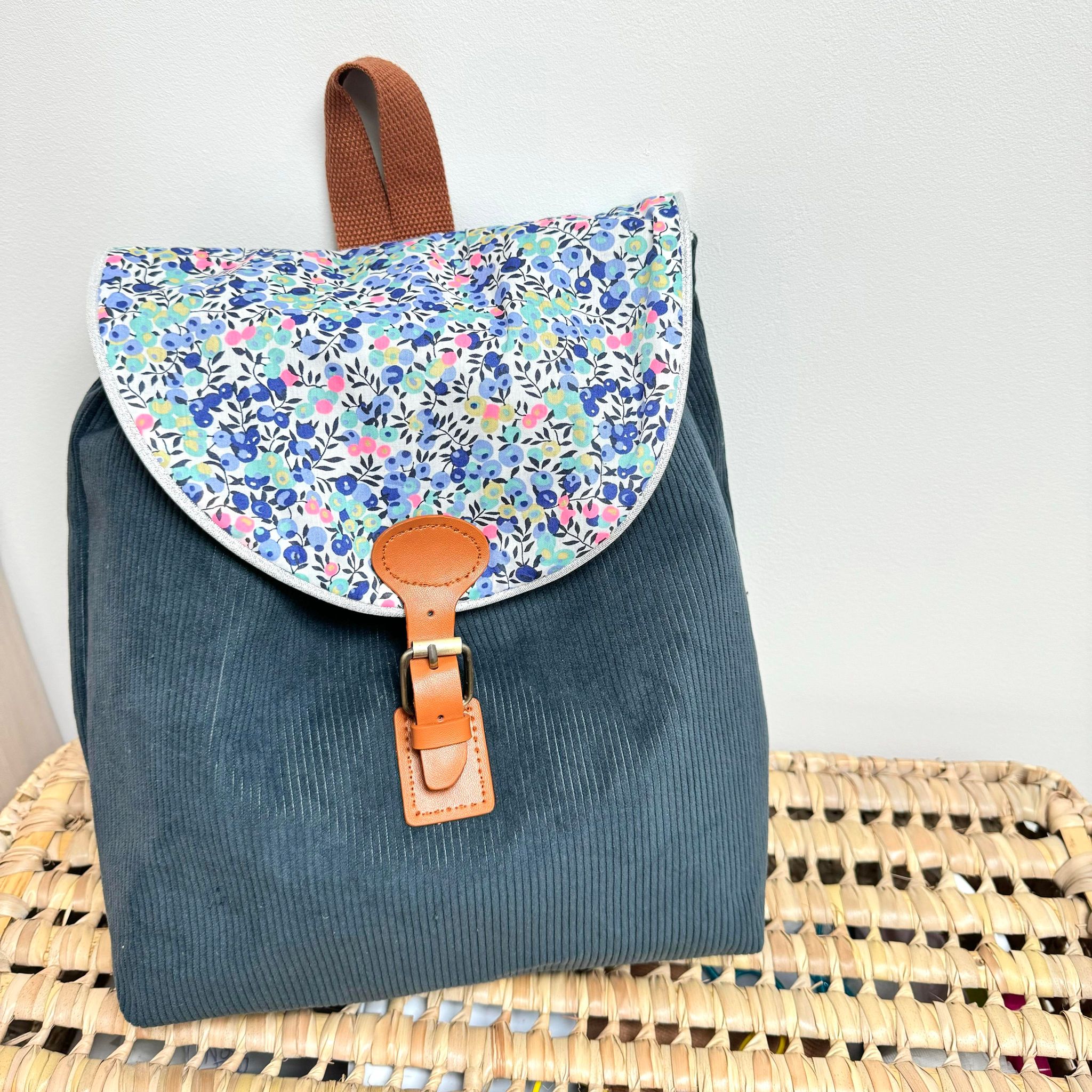 Sac à dos en coton uni crème à l’intérieur et velours et liberty à l’extérieur, se ferme par une pression aimanté (cachée derrière la jolie boucle).