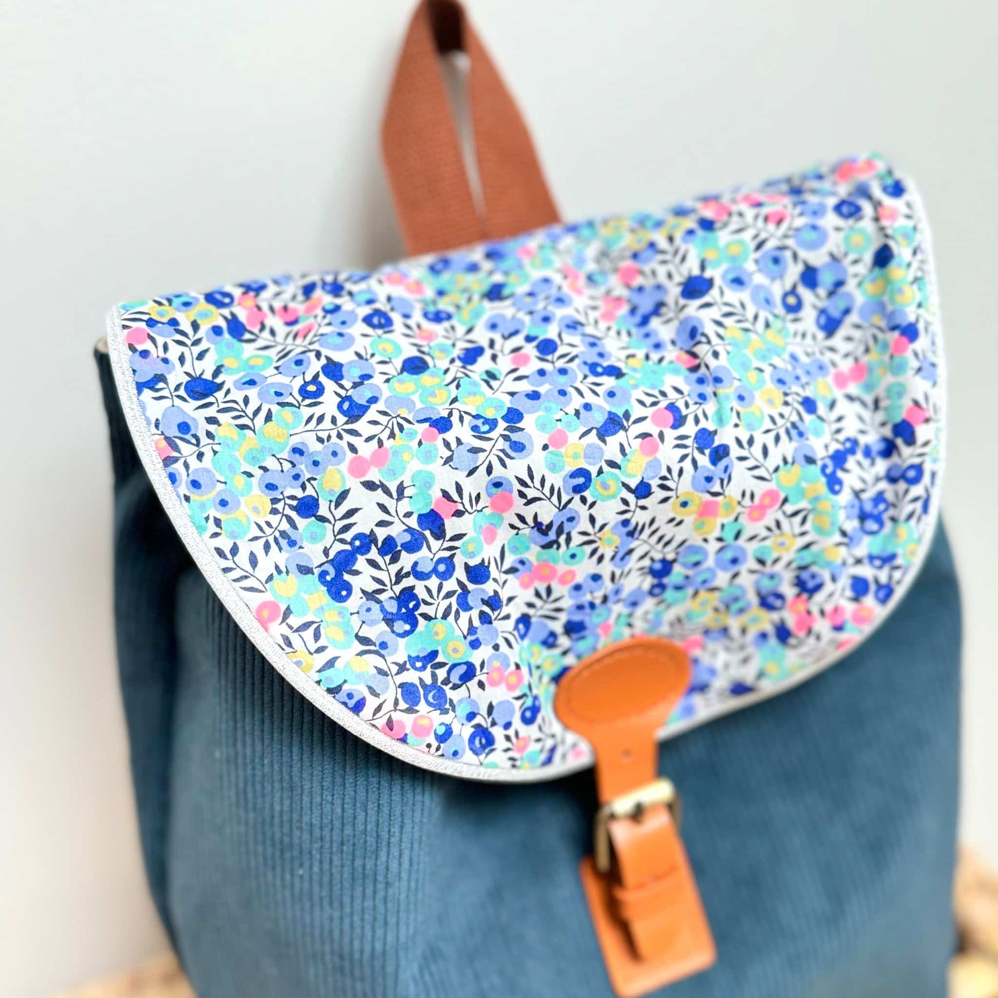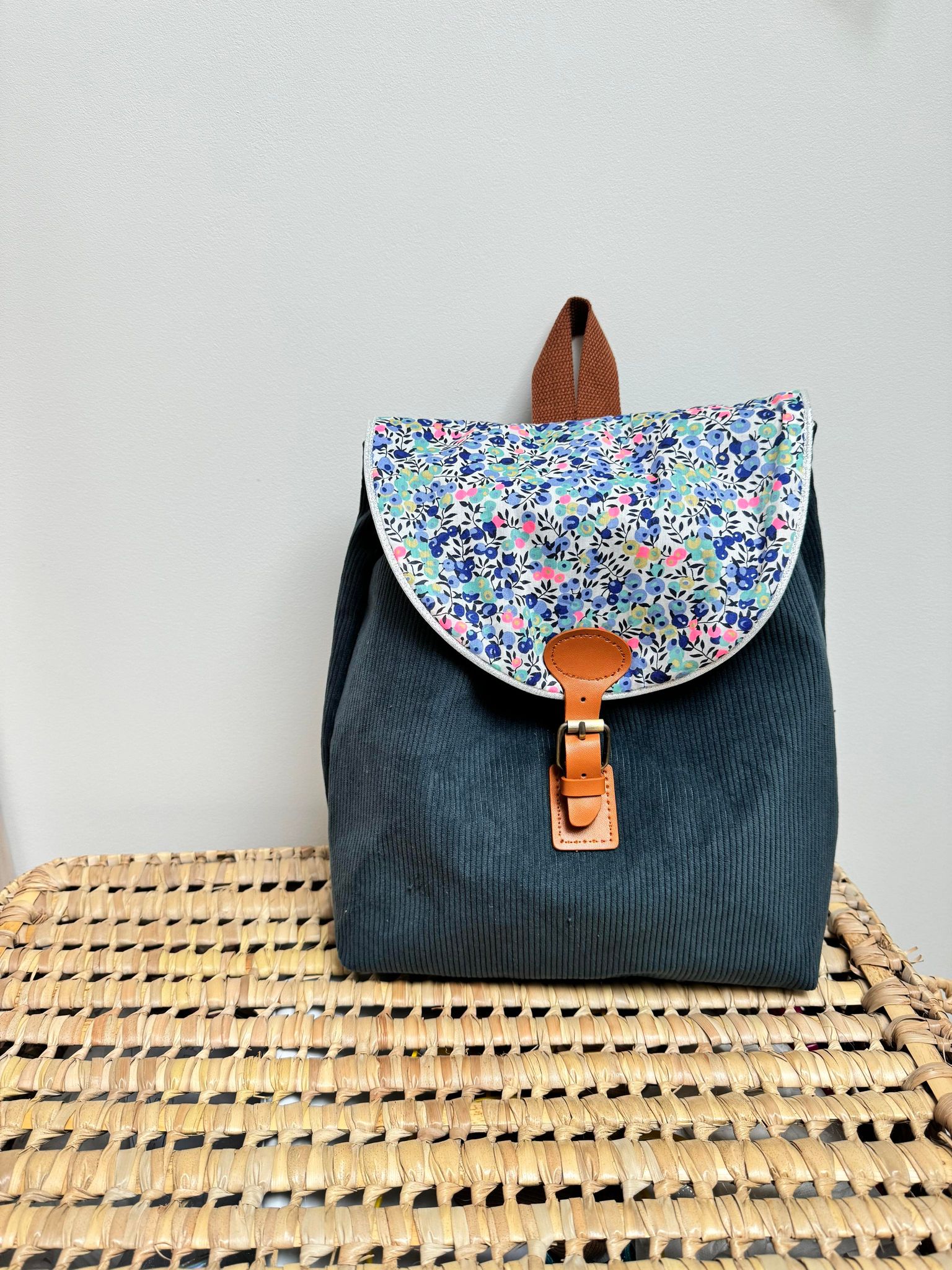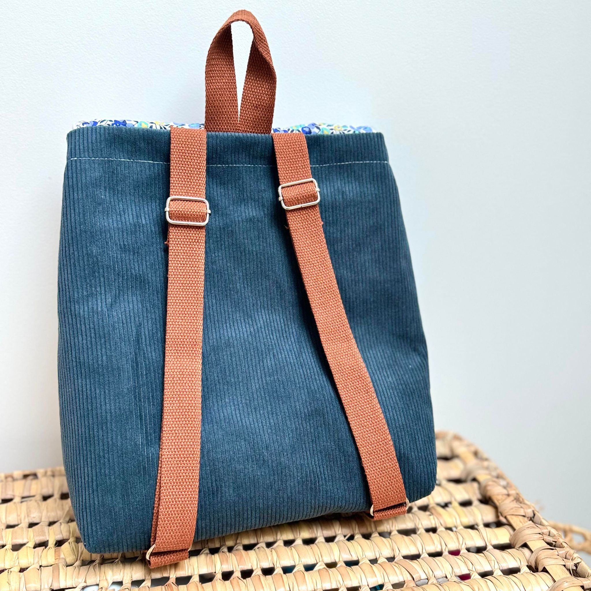 Sac à dos, velours côtelé marine et liberty wiltshire fluo