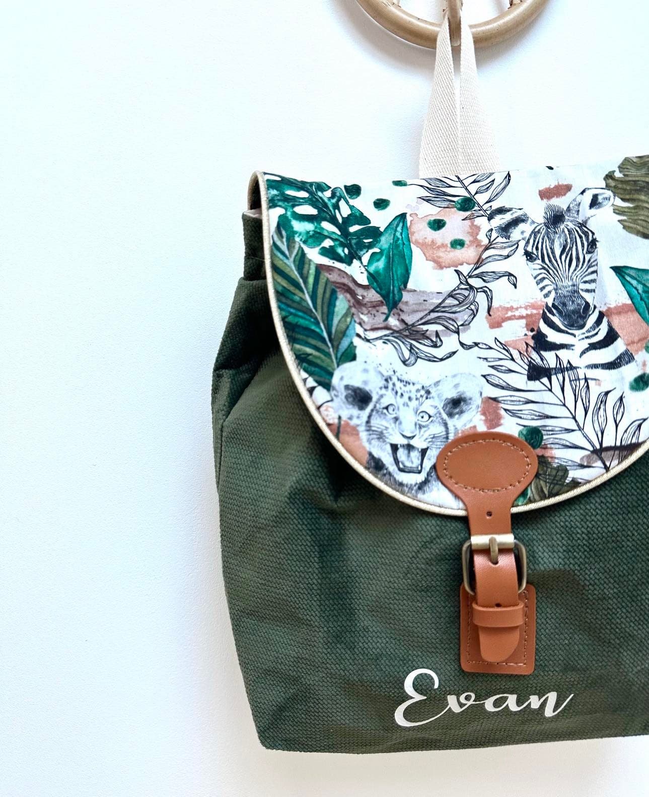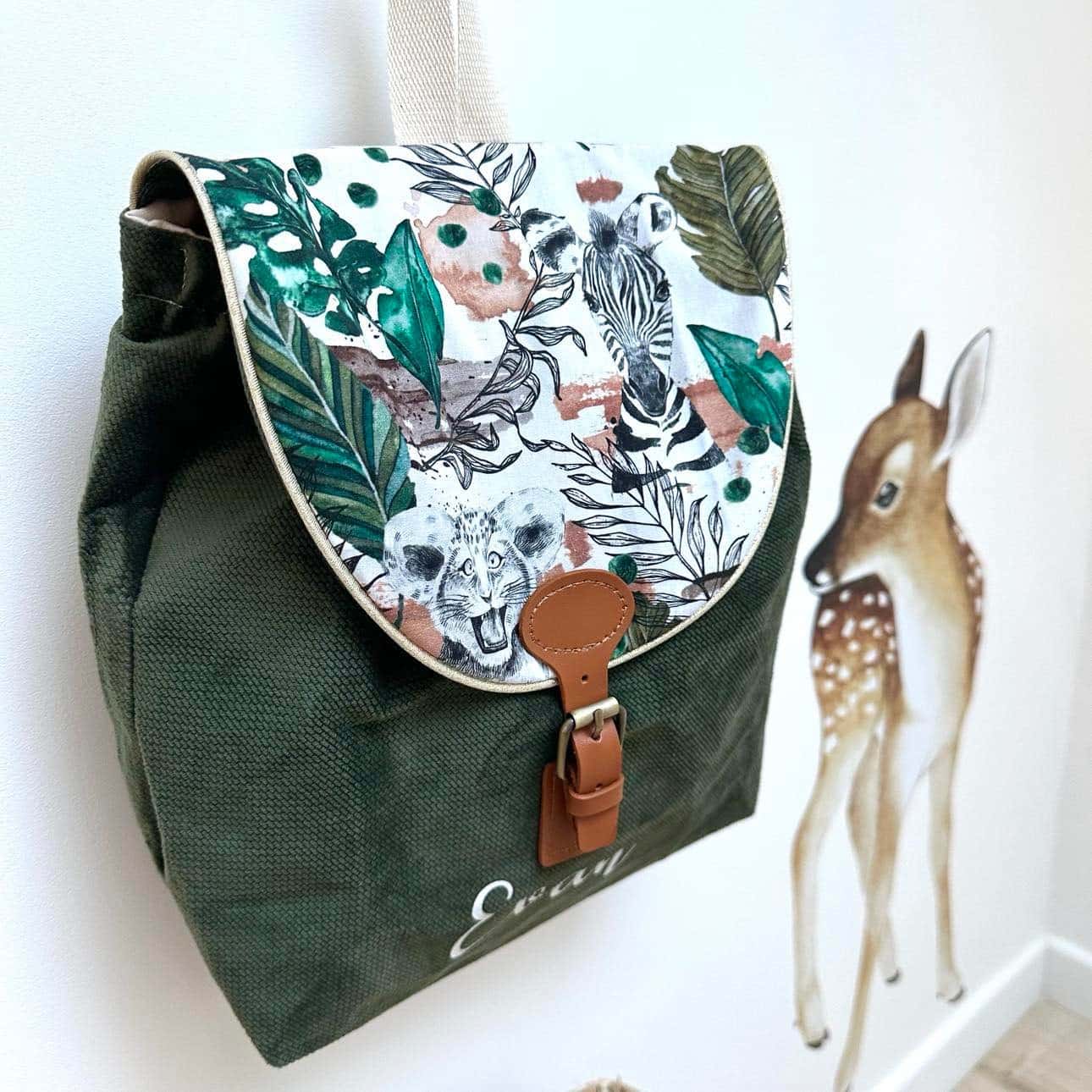 Sac à dos en coton et velours côtelé, se ferme par une pression aimanté (cachée derrière la jolie boucle).