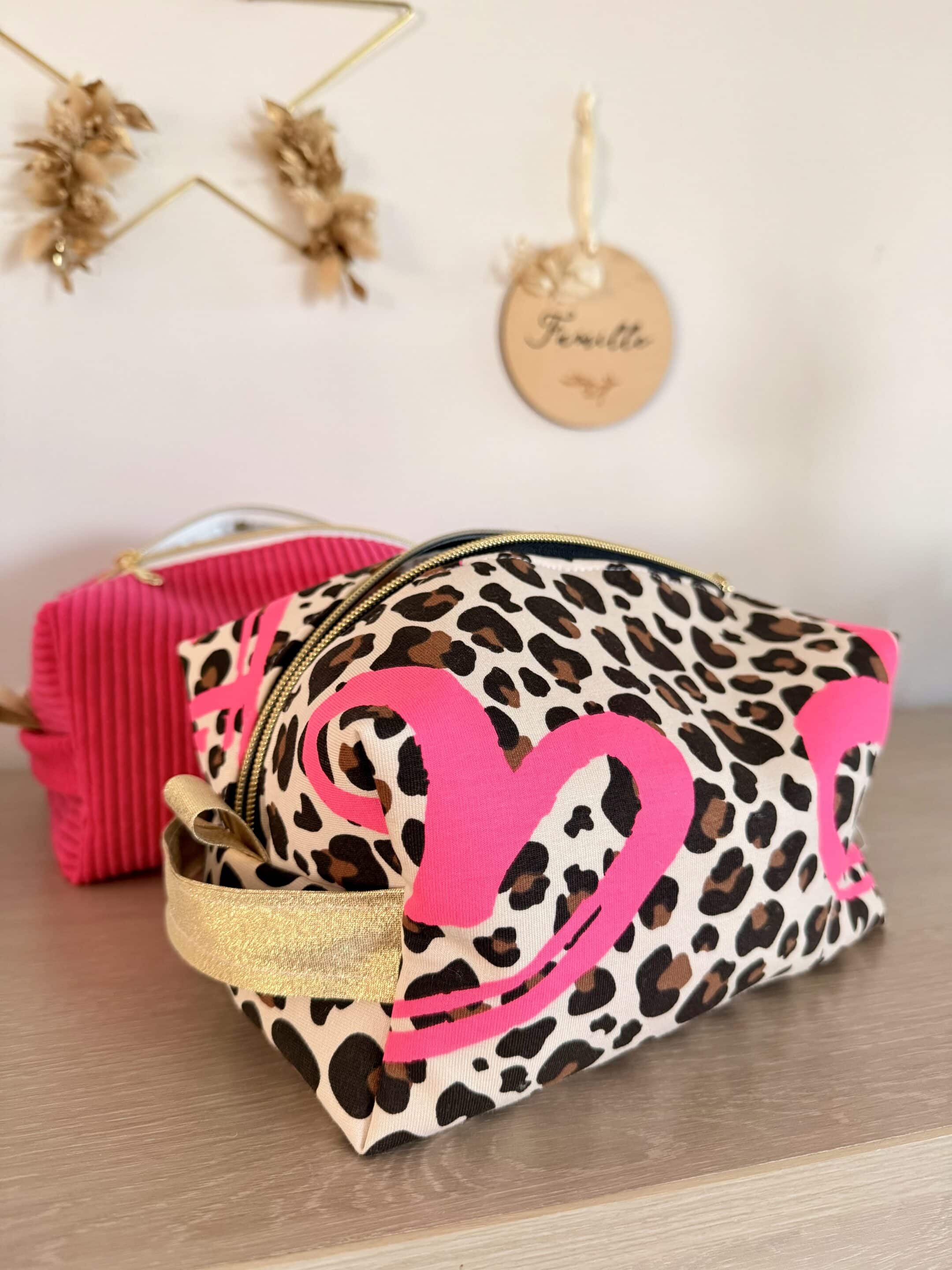 Trousse de toilette matelassé en jersey léopard avec gros coeur fuchsia. Intérieur en uni crème