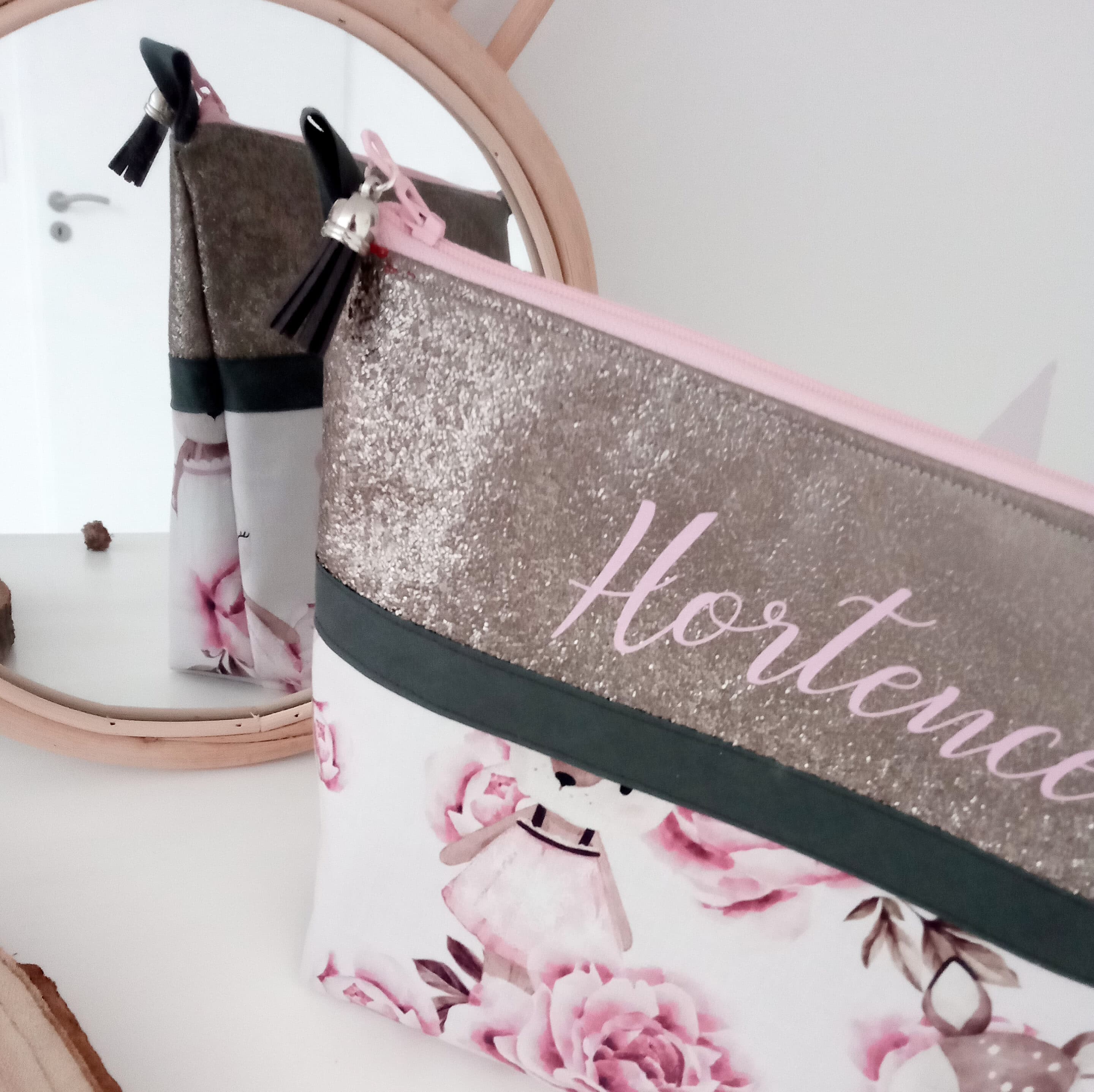 Trousse de toilette, simili martelé bronze faons et pivoines